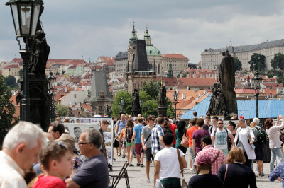 Hier begeben wir uns auf die ausgelatschten Trampelpfade der Stadt, dessen prachtvolle Bauten die letzten zwei Weltkriege mangels Bombenangriffen fast unbeschadet überstanden haben. Wir schlendern zusammen mit Tausenden Japanern, Amerikanern und noch mehr Russen zur zehn Meter breiten Karlsbrücke. Natürlich sind auch Tschechen unterwegs, doch die russische Sprache dominiert merklich. So ziemlich jeder Tourist wird diese Brücke einmal passieren und jeder Besucher, der von der Altstadt aus die Kleinseite und dort vermutlich die Burg besuchen will, wird sie benutzen.
