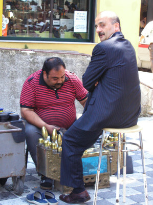 Dort wo Autos nur mehr schwer durchkommen, sind die Träger und Sackkarrenschieber zugange, die große Kartons oder pralle Plastiksäcke durch die Gassen zerren und schieben. Die Träger haben große Holzgestelle auf dem Rücken, die mit dicken Kelims gepolstert sind. Kraxen türkischer Machart sozusagen. Schuhputzer wienern Schuhe. Wir würden uns ja auch gern mal diesen Luxus gönnen: nur bei unseren Trekkingsandalen hätte der Putzer wohl einige Probleme.